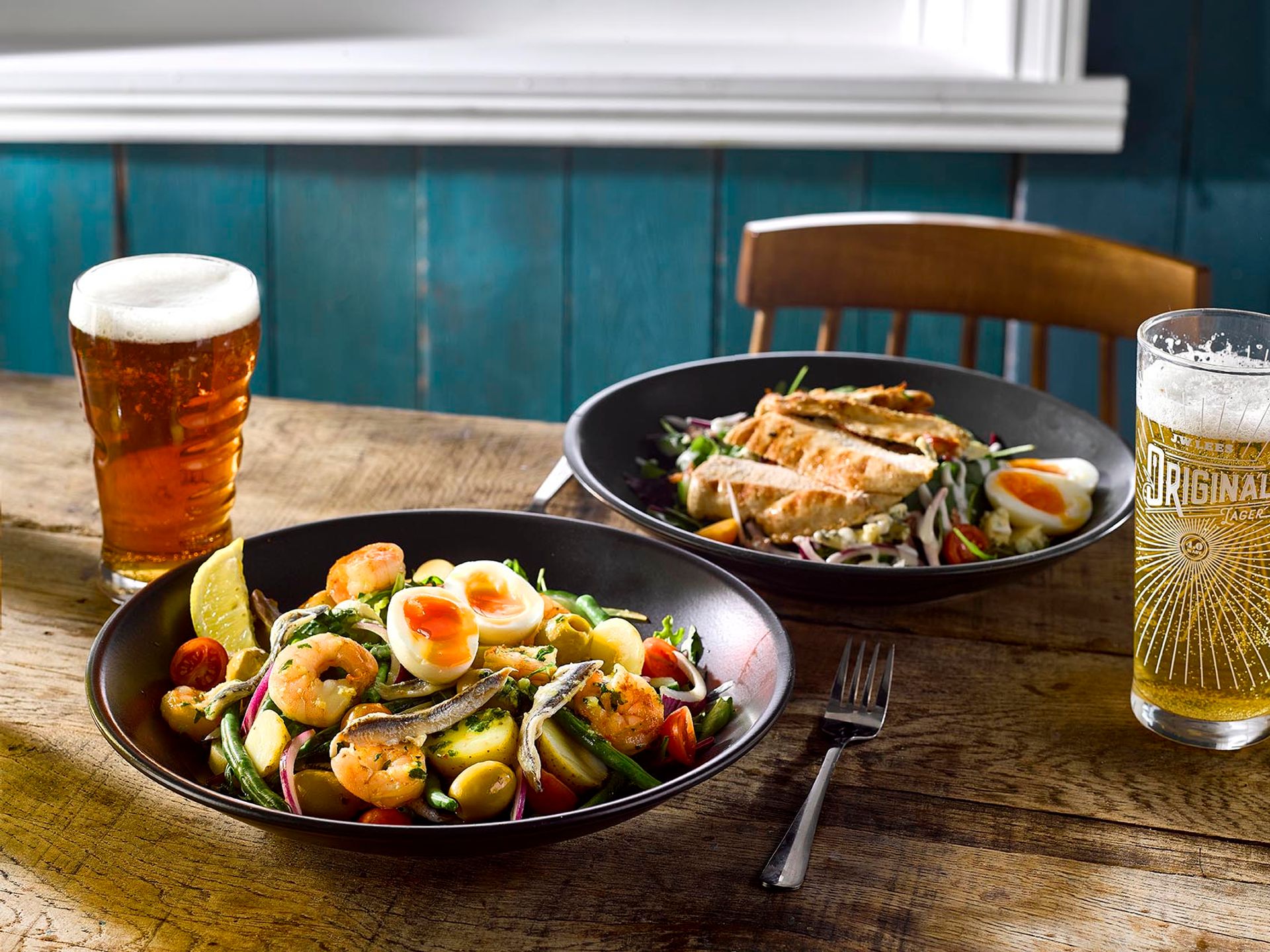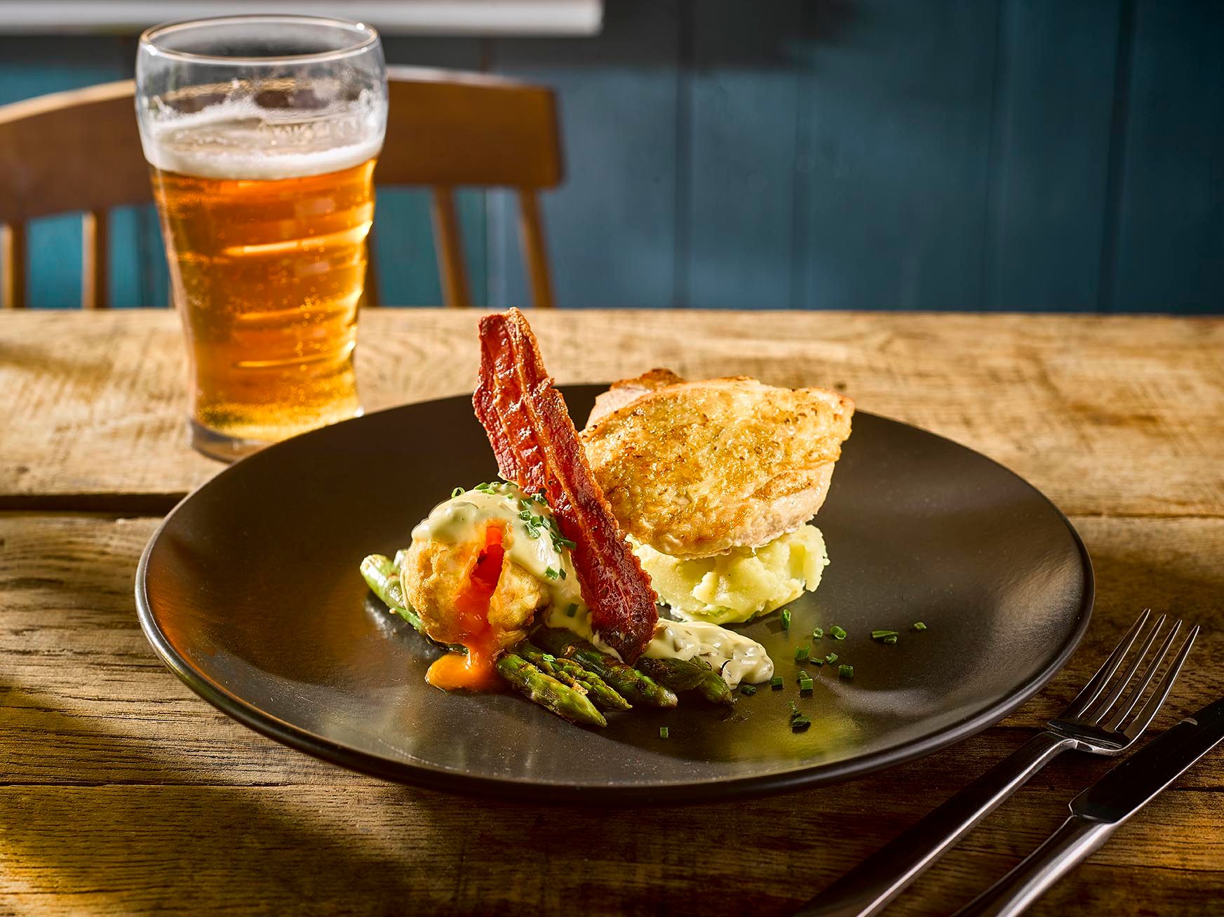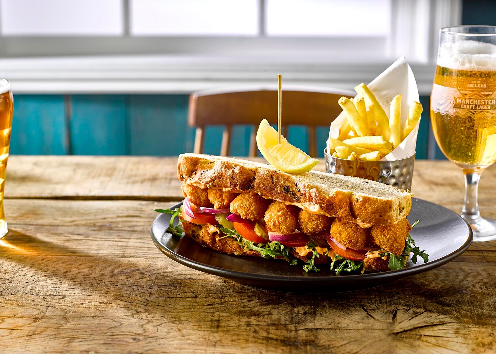 (V) – suitable for vegetarians, (VG) – suitable for vegans, (VGA) – vegan option available, (NGCI) – No Gluten Containing Ingredients, * Can be cooked without gluten. POA = Price On Application. Please ask your server for the price. lf you suffer from a food related allergy please inform a team member for advice before you order. Not all ingredients are listed on the menu & our kitchen uses nuts, gluten and other allergens. Although every care is taken to prevent cross contamination of allergens we cannot guarantee it. Should the listed product be unavailable due to circumstances affecting the supply chain it may be replaced by a similar alternative product. Fish may contain bones. Cooking oil may contain genetically modified ingredients. The calories listed are per serving, additional items to a dish (eg: sauces) are listed separately. Adults require around 2000kcal per day. Weights stated are uncooked and approximate. Prices are GBP. *MPA is our JW Lees Manchester Pale Ale; a golden ale brewed in Manchester entirely from all British malt.